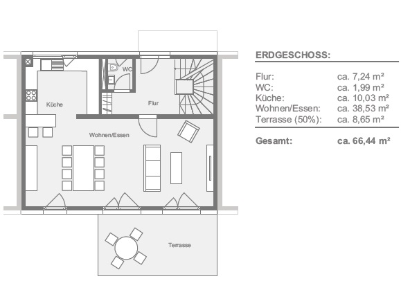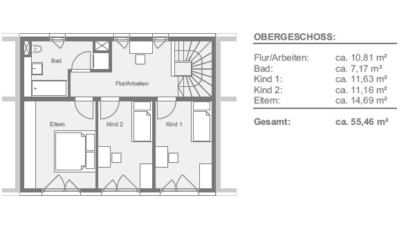Im Erdgeschoss befinden sich der äußerst großzügige Wohn- und Essbereich mit knapp 38 m² und angrenzender, offener Küche von rund 10 m². Zudem besteht hier Zugang zur schönen Südterrasse mit rund 7 m² und zum Gartenanteil. Weiterhin findet sich hier ein separates Gäste-WC. Über den Flur gelangt man zudem zum Obergeschoss und den drei weiteren Zimmern – die beiden Kinderzimmer mit rund 11 m² sowie das Schlafzimmer mit rund 15 m². Auch das hochwertig ausgestattete Badezimmer mit Wanne, ebenerdiger Dusche, WC und Handtuchheizkörper findet sich im Obergeschoss. Der Flur mit rund 10 m² bietet zudem die Möglichkeit für einen schönen Arbeitsplatz direkt am Fenster.