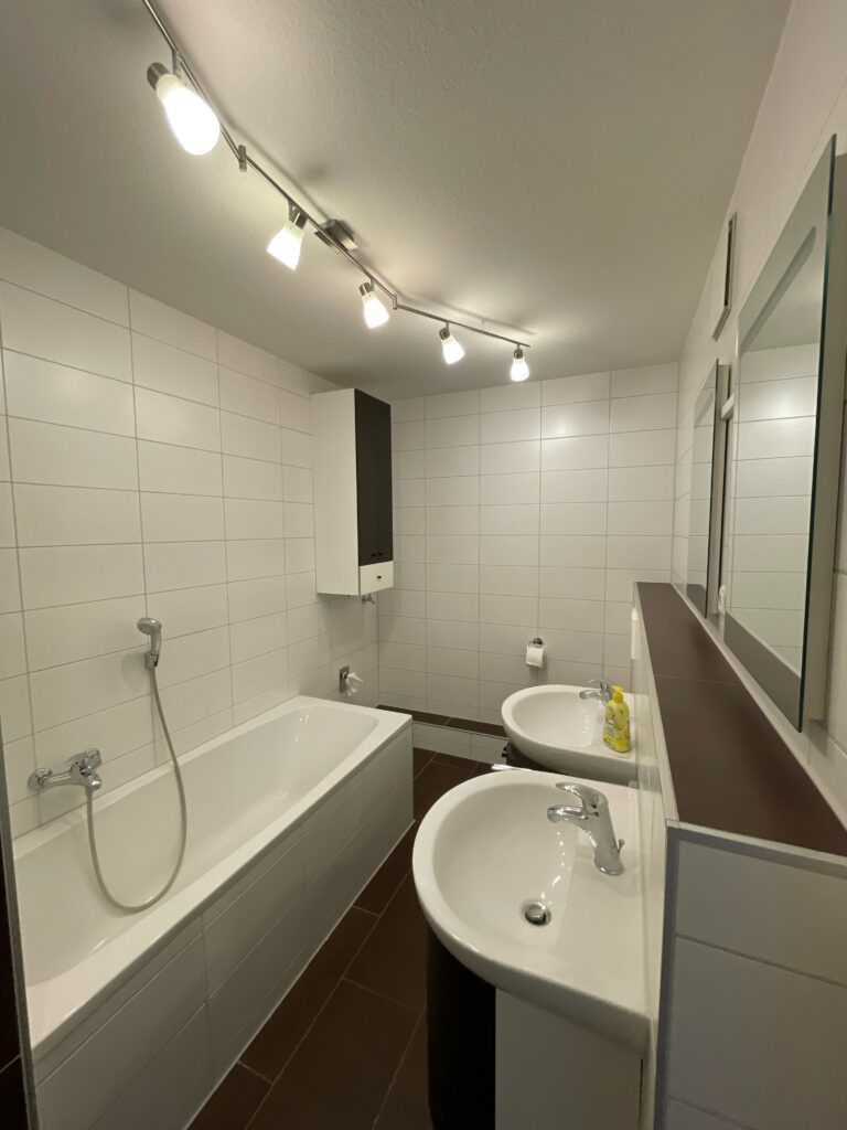 Das Badezimmer ist funktional, aber dabei topmodern eingerichtet und verfügt über eine Dusche, eine Wanne und einen Waschmaschinenanschluss.