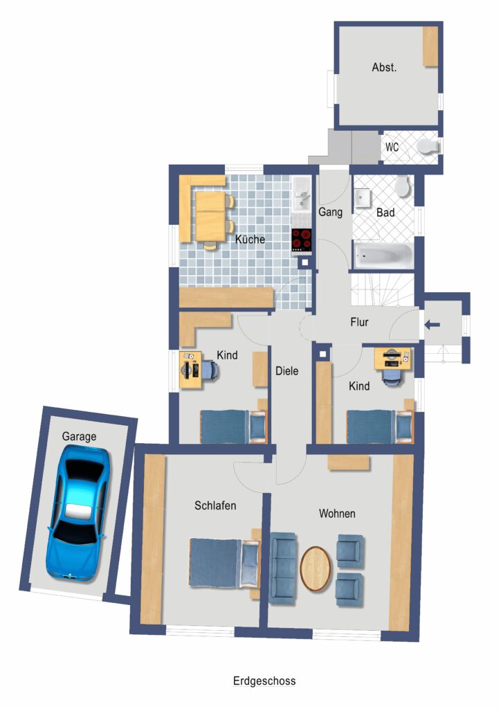 Das Haus erstreckt sich über mehrere Ebenen und verfügt über eine klassische, funktionale Grundrissstruktur. Im Erdgeschoss befinden sich die zentralen Wohnräume mit Wohn- und Essbereich sowie separater Küche. Die Räume bieten eine gute Grundfläche, entsprechen jedoch in Ausstattung und Zustand überwiegend nicht mehr heutigen Wohnstandards.